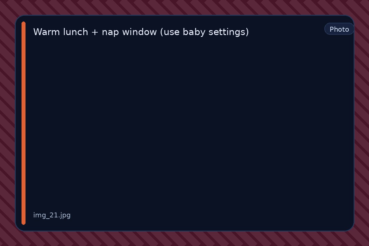 - Pack: diapers+wipes+1 spare outfit+small blanket+snacks